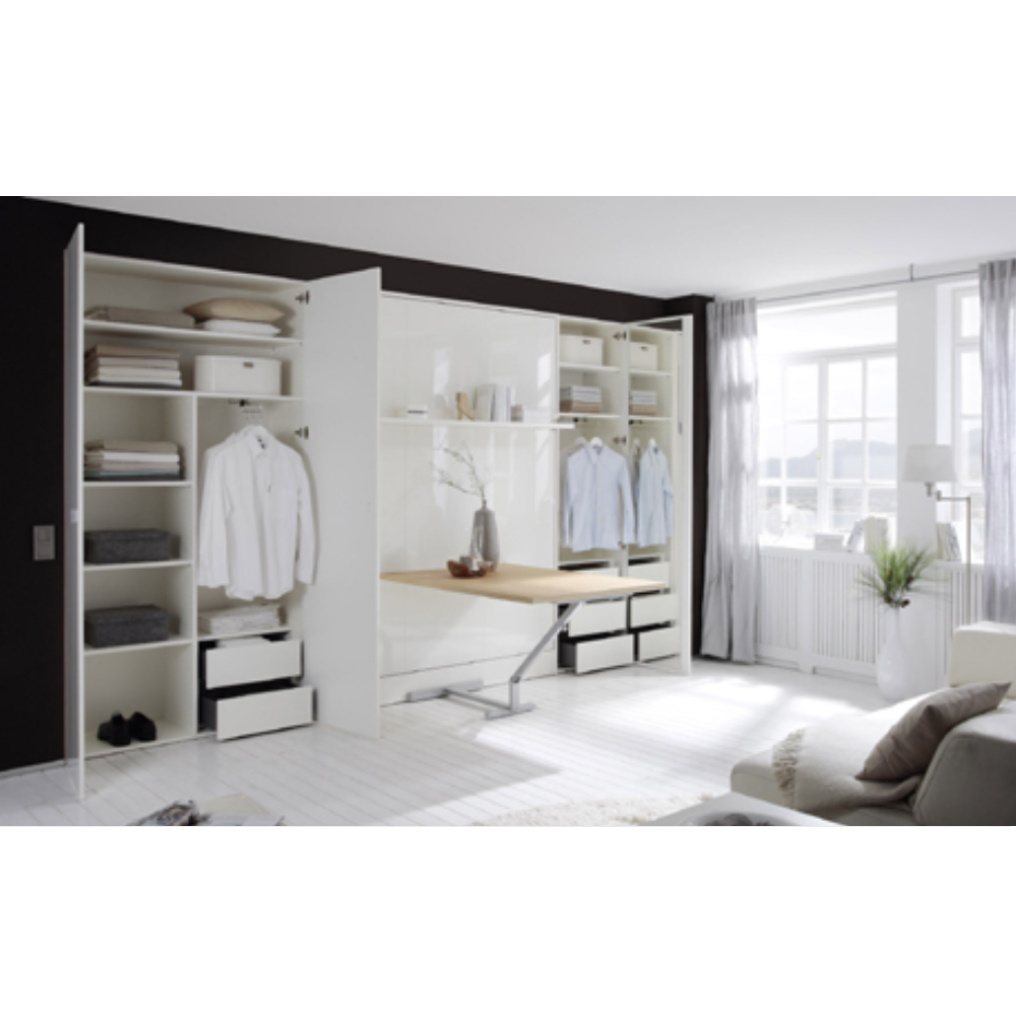 2 wei raum wunder rooms solution with med cabinets and table from German Nehl Wohn Idéen. The wall bed comed as standard with automatically out folding legs / shelf that comes down when you open the front. The shelf / handle have adjustable legs so that the legs are straight even if the floor should be uneven.
