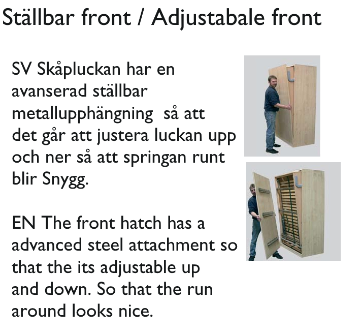 OBS! Alla sängskåp skall monteras fast i väggen, är man osäker rekommenderar vi att man anlitar en montör som vet hur man fäster tunga saker i en vägg så att väggen håller för vikten när sängen fälls ner. T.ex en gipsvägg håller inte om man inte hittar och fäster i en regel. Har du frågor angående montering är du givetvis välkommen att ringa så hjälper vi dig. Vi tillhandahåller själva monteringslösningar inom Skåne och kan förmedla tjänsten i stora delar av Sverige.