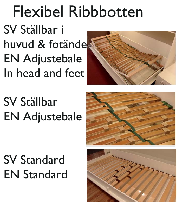 - Fem olika madrasser att köpa till eller så kan du använda en egen valfri madrass som passar i måtten 90 x 200 cm och max 18 cm hög.