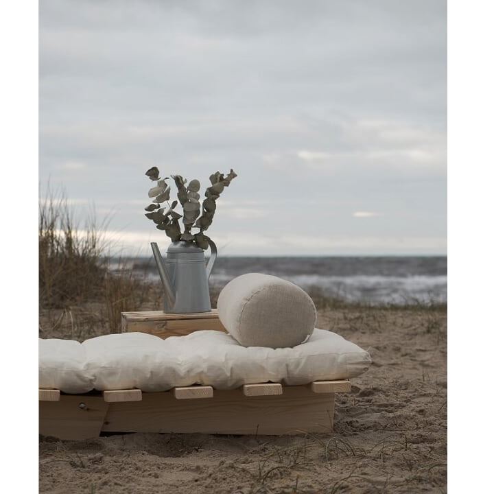 The mattress is made with a fill of 100% natural cotton and the fabric is 100% cotton and available in a variety of fabrics. The rustic wood frame has solid 3 cm thick pinewood slats to place the mattress on.