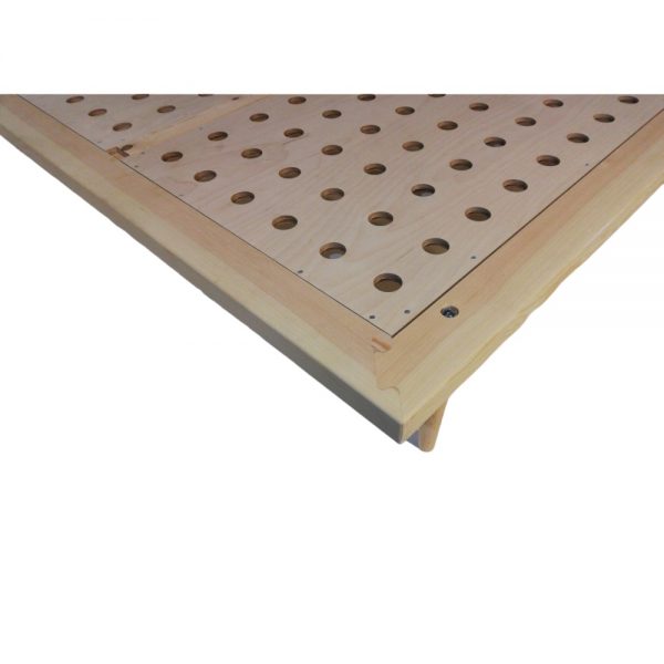 Styletto bed frame with perforated bed base from Österlen’s bedside cabinet factory. The bed frame is made for a futon mattresses with a bespoke perforated bed base that provides the rigidity needed for a futon mattress. The perforated base also provides great ventilation for the mattress.