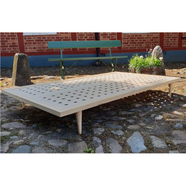 A bed frame made in Österlen in southern Sweden with Swedish pine wood. Tranesgården is a solid bed frame made in one peace, except for the legs that are fastened to the bed frame, so that it do not become unstable and wobbly as many flat pack beds.